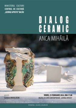 Centrul de Cultură „George Apostu” din Bacău vă invită să participați în data de 23 februarie 2024, ora 17.00, la deschiderea Expoziției de artă decorativă „Dialog ceramic”, semnată de Anca Mihăilă, membru al Uniunii Artiștilor Plastici, Filiala Arte Decorative București.