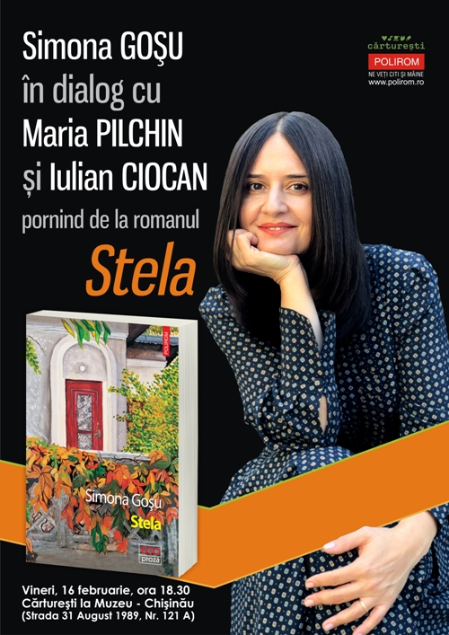 Vineri, 16 februarie 2024, ora 18.30, la Librăria Cărturești la Muzeu – Chișinău (Strada 31 August 1989, Nr. 121 A), Simona Goșu va intra în dialog cu Maria Pilchin și Iulian Ciocan, pornind de la romanul ”Stela”, apărut în colecția Ego. Proză.