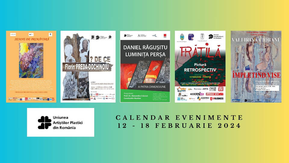 Vineri, 16 februarie, Filiala Râmnicu Vâlcea a Uniunii Artiștilor Plastici din România și Primăria Municipiului Râmnicu Vâlcea organizează, în parteneriat cu filialele Pitești și Craiova ale UAP din România, expoziția interjudețeană „Semne de Primăvară”, ce se va desfășura în spațiile expoziționale ale Galeriei Artex și ale Galeriilor Cozia Pasaj din Râmnicu Vâlcea. Vernisajul va avea loc la ora 18, în Galeria Artex.Parteneri media ai Uniunii Artiștilor Plastici din România: Radio România Cultural, Radio România Internațional, Agerpres, Amos News, CooltNeamț, Zile și Nopți, Revista Arta, Modernism.ro, Top Business, Piața de Artă.