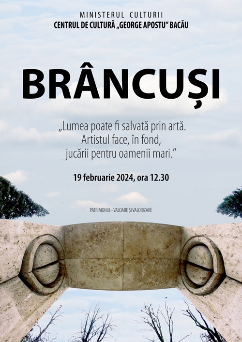Având o preocupare constantă pentru promovarea valorilor culturii naționale, Centrul de Cultură „George Apostu” va organiza luni, 19 februarie 2024, începând cu ora 12.30, de ZIUA NAȚIONALĂ CONSTANTIN BRÂNCUȘI, un eveniment cultural ce are ca obiectiv prezentarea vieții și operei „părintelui sculpturii moderne”.