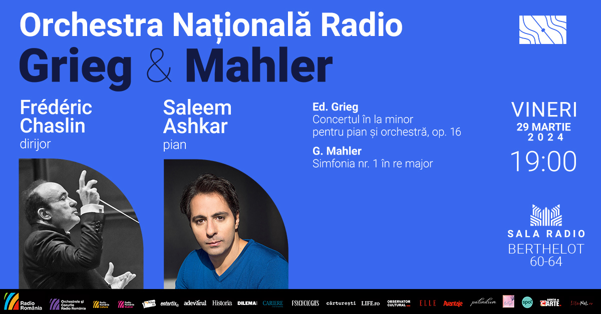 Vineri, 29 martie 2024 (de la 19.00), alături de ORCHESTRA NAȚIONALĂ RADIO va urca pe scenă cunoscutul dirijor și compozitor francez FRÉDÉRIC CHASLIN – care a creat Dansul Divei din muzica filmului Al cincilea element (Luc Besson, 1997). Acesta revine la Sala Radio pentru un concert ce reunește doi mari compozitori: GRIEG (Concertul în la minor pentru pian și orchestră) și MAHLER (Simfonia I – Titanul). AgențiadeCarte.ro este partener media al evenimentului.