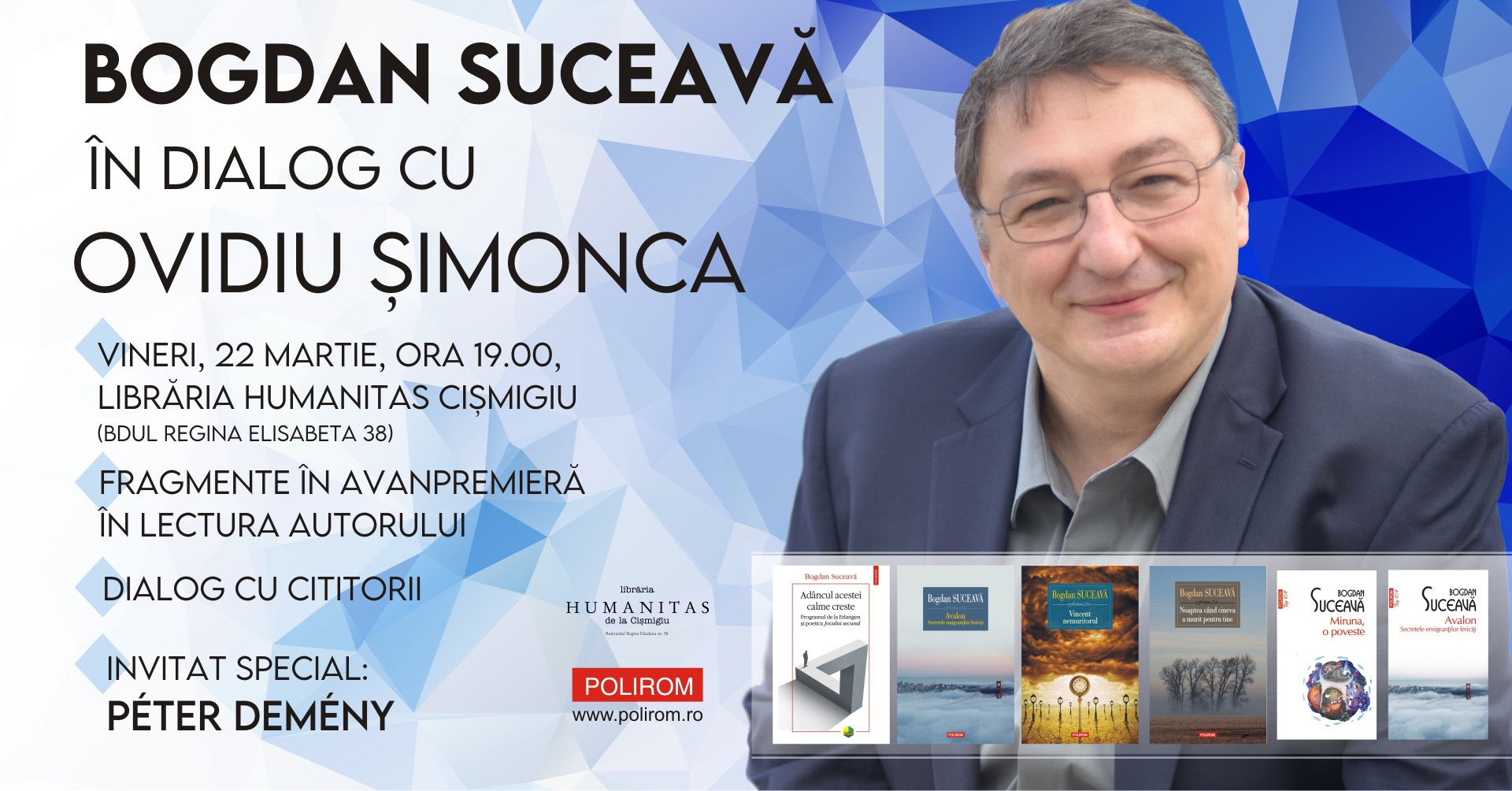 Vineri, 22 martie 2024, la ora 19.00, la Librăria Humanitas de la Cișmigiu (B-dul Regina Elisabeta 38, București), va avea loc o întâlnire a scriitorului Bogdan Suceavă cu cititorii bucureșteni. Autorul va citi un fragment în avanpremieră din volumul la care lucrează în prezent, iar lectura va fi urmată de un dialog cu Ovidiu Șimonca și Péter Demény.