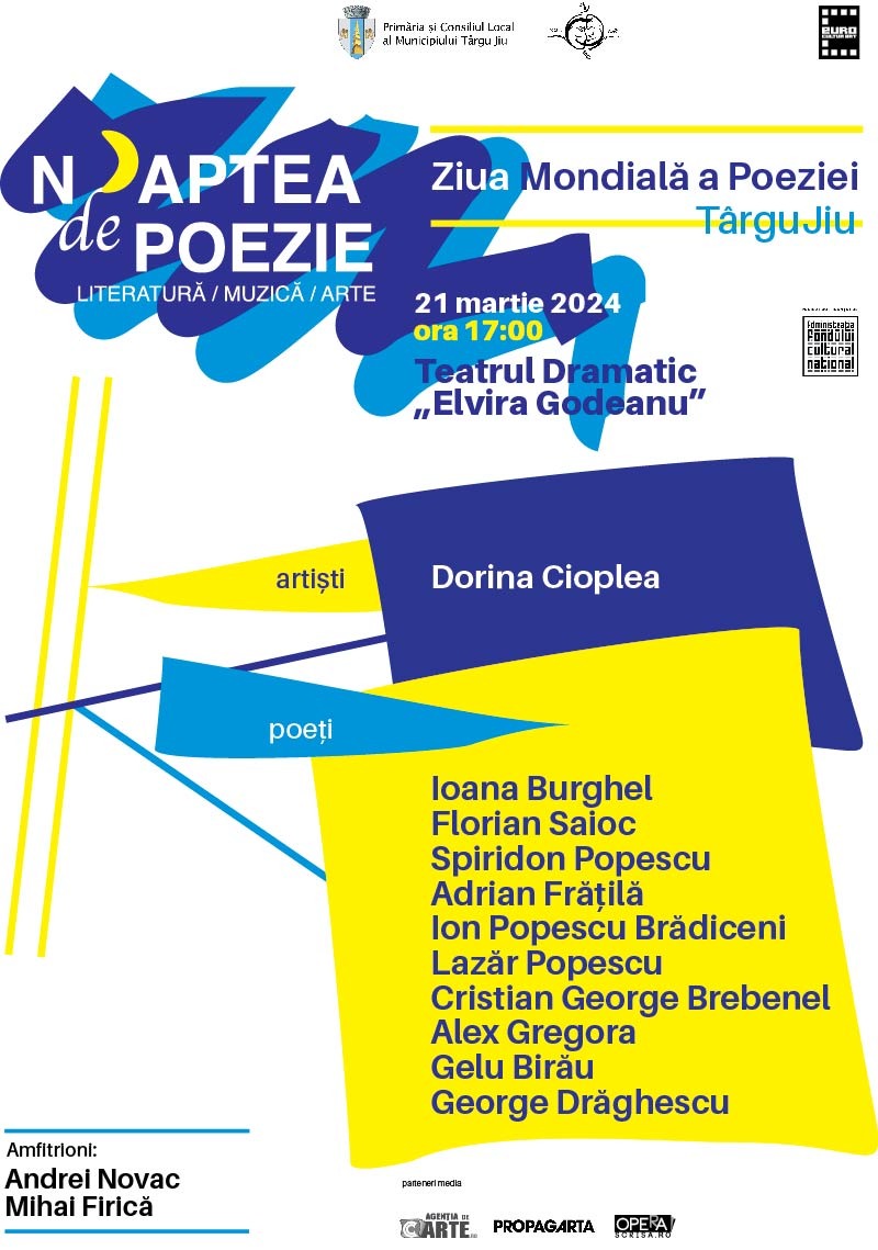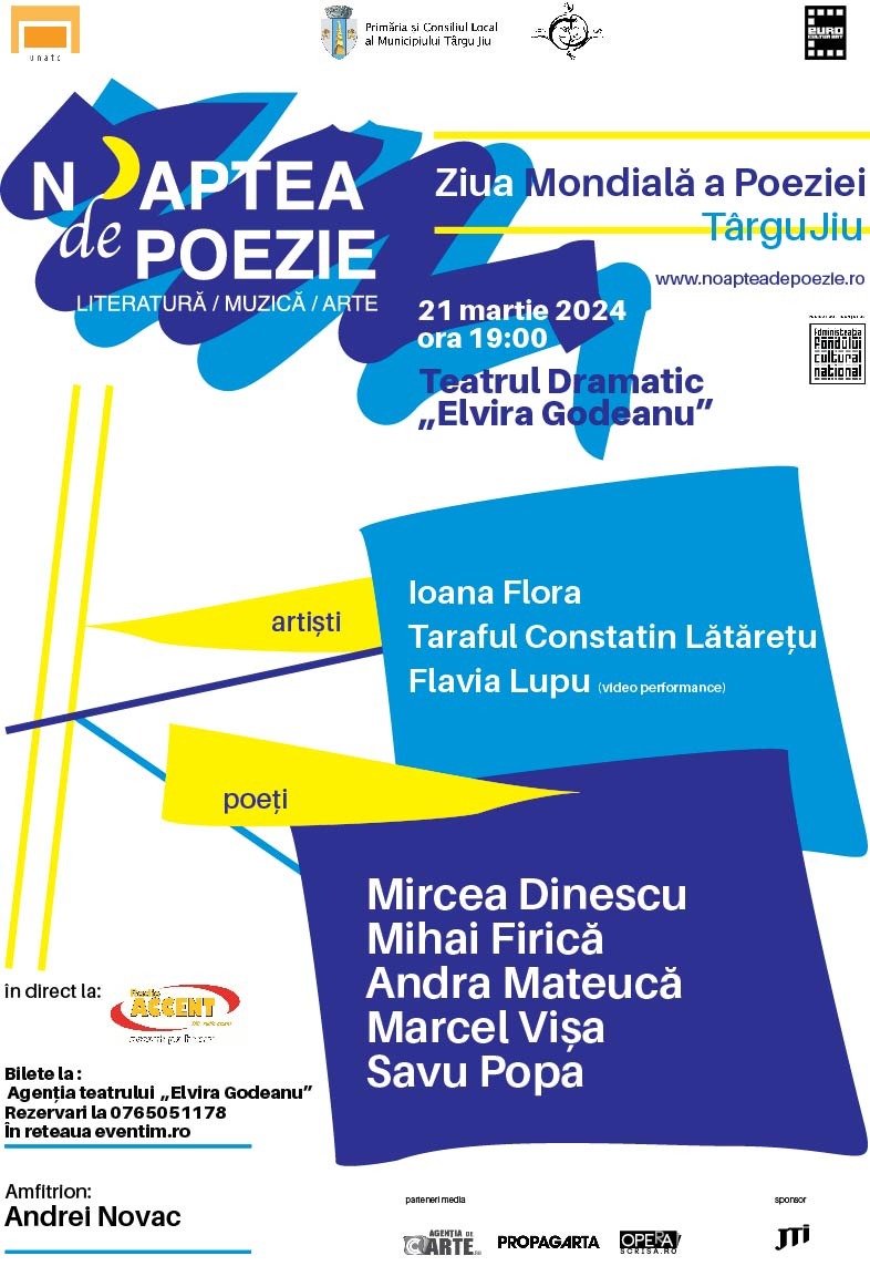 Joi, 21 martie 2024, de la ora 17 și de la ora ora 19, la Teatrul Dramatic ”Elvira Godeanu” din Târgu Jiu (str. Victoriei nr.36), are loc proiectul de literatură, muzică și arte „Noaptea de Poezie”, în cadrul programului omonim ce se desfășoară în 10 spații culturale exponențiale din 7 orașe din România. Invitatul special este inegalabilul Mircea Dinescu!