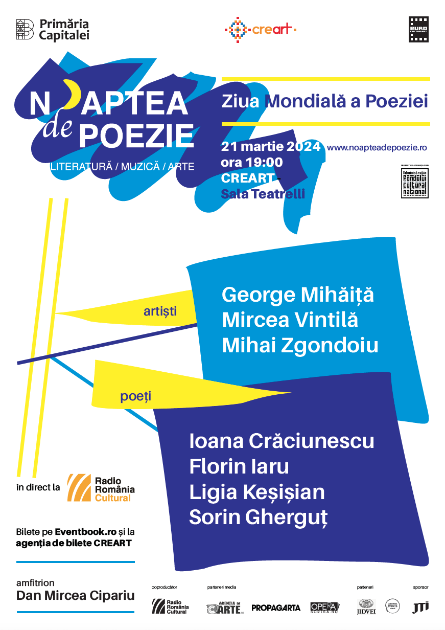 ”O noapte de poezie fastuoasă! – vă spune Dan Mircea Cipariu din sala Teatrelli Creart, unde rezonăm cu lecturi poetice și muzicale de Ziua Mondială a Poeziei. Suntem la secvența inaugurală a programului Noaptea de Poezie, într-o transmisie în direct pe Radio România Cultural, în cadrul programului omonim ce se desfășoară în 10 spații culturale exponențiale din 7 orașe din România. Organizatori sunt Primăria Municipiului București, prin CREART – Centrul de Creaţie, Artă şi Tradiţie al Municipiului Bucureşti, și asociația Euro CulturArt, cu sprijinul financiar al AFCN (Administrația Fondului Cultural Național), având ca parteneri JTI, Opera Scrisă.ro, Colonial Events și Jidvei. Parteneri media sunt AgentiadeCarte.ro și Propagarta.ro.
