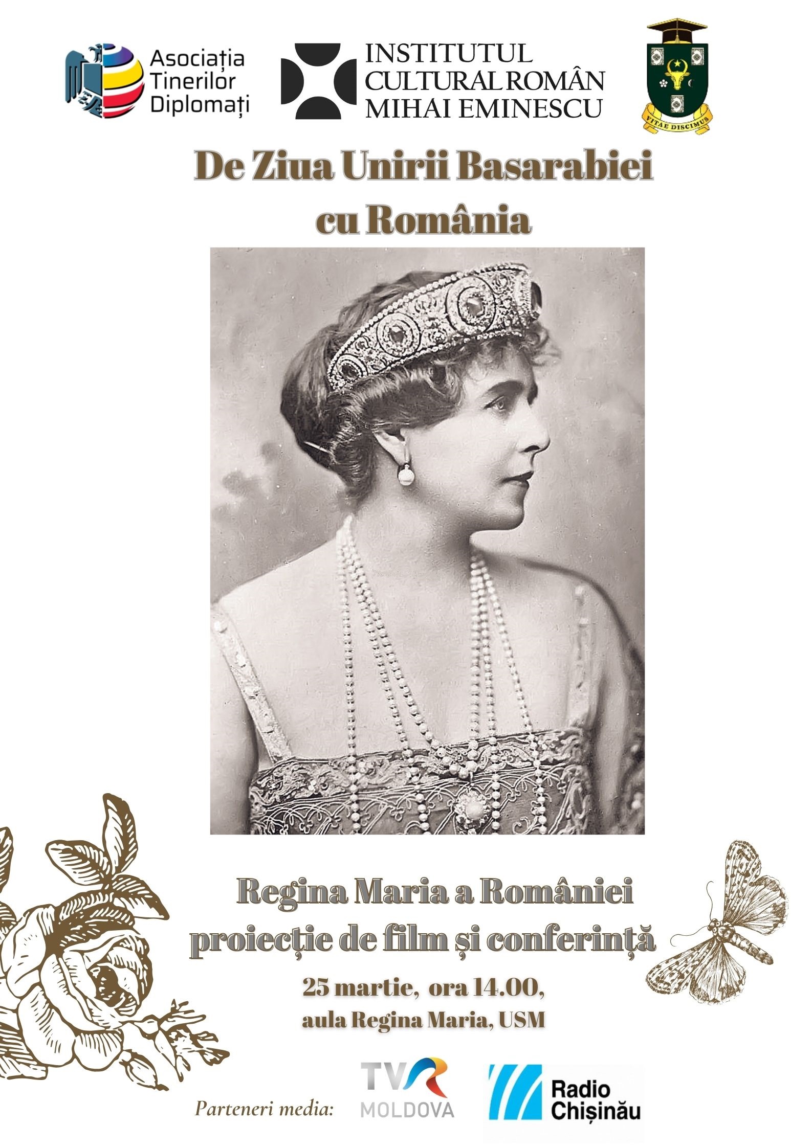 ICR Chișinău în colaborare cu Universitatea de Stat din Moldova și Asociația Tinerilor Diplomați din Republica Moldova organizează, pe data de 25 martie 2024, ora 14.00, pentru a marca Unirea Basarabiei cu România, o conferință urmată de proiecția documentarului Maria – inima României (2018, regia Trevor Poots). Evenimentul va scoate în evidență rolul jucat de Regina Maria în procesul de pregătire și unire a provinciilor istorice românești și, în special, contribuția ei în recunoașterea României Întregite de către marile puteri europene.