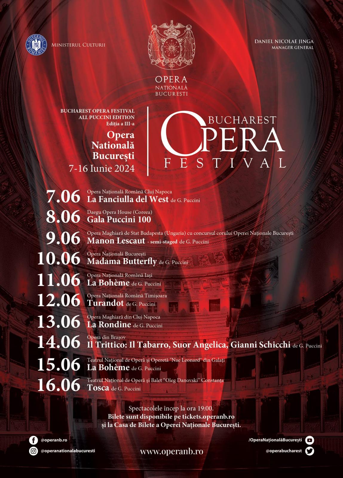 Bucharest Opera Festival – All Puccini Edition are pe afiş în cele 10 seri de festival, nu mai puţin de 8 producţii din creația marelui compozitor, un spectacol semi-staged, o gală de operă și 10 teatre: Opera Maghiară de Stat din Budapesta, Daegu Opera Festival din Coreea, Opera Națională Română Iaşi, Opera Naţională Română din Cluj Napoca, Opera Națională Română Timişoara, Opera Maghiară din Cluj-Napoca, Teatrul Național de Operă și Balet „Oleg Danovski” din Constanţa, Opera din Braşov, Teatrul de Operă şi Operetă „Nae Leonard” din Galaţi şi, bineînţeles, Opera Naţională din Bucureşti.