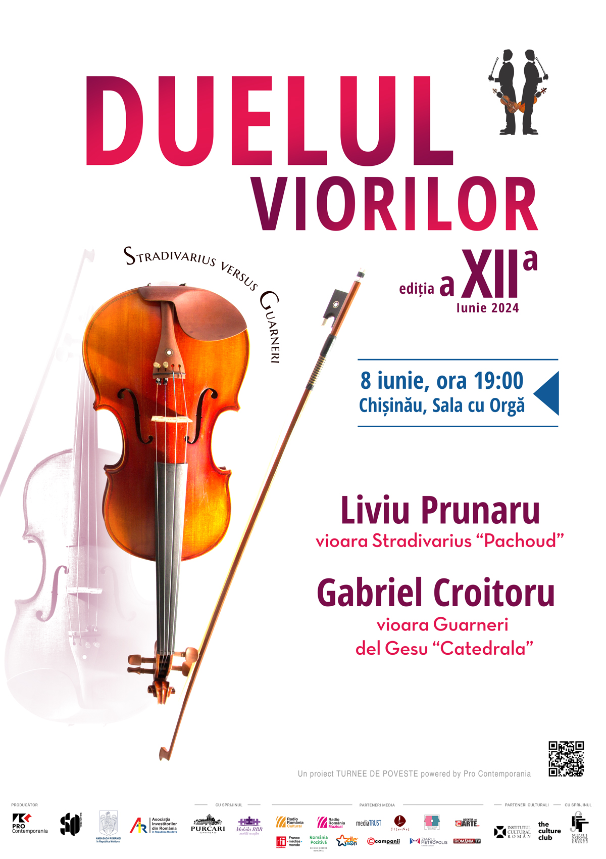 Violoniștii Liviu Prunaru și vioara Stradivarius ”Pachoud” și Gabriel Croitoru, cu Guarneri del Gesù ”Catedrala” (pusă la dispoziție de Muzeul Național „George Enescu”, în al cărui patrimoniu se află) se vor duela, acompaniați de pianistul Mihai Ungureanu, pe 8 iunie, de la ora 19:00, la Chișinău, la Sala cu Orgă. AgențiadeCarte.ro este partener media al evenimentului.