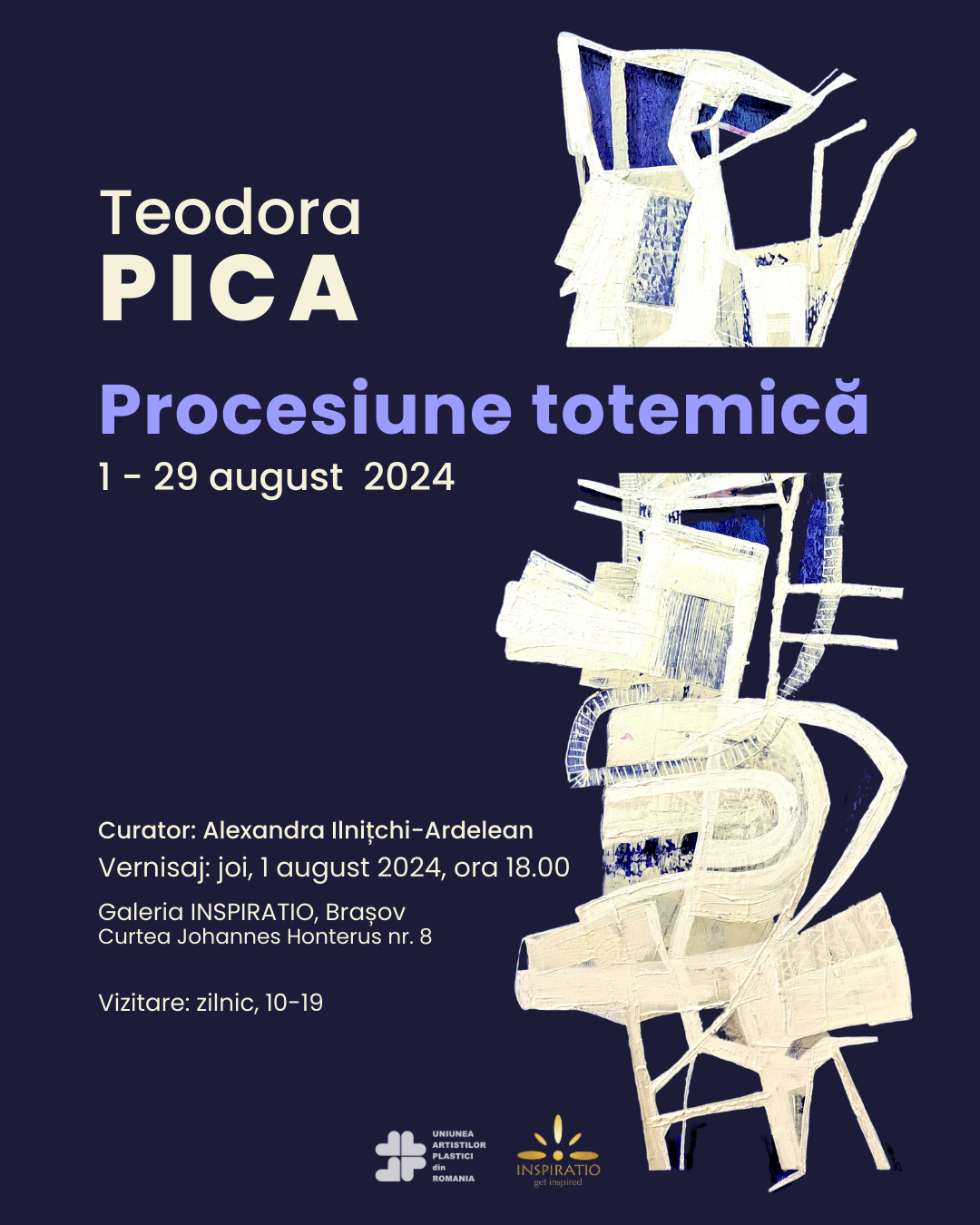 Galeria INSPIRATIO vă invită joi, 1 august 2024, începând cu ora 18.00, la vernisajul expoziției personale „Procesiune totemică” a artistei Teodora PICA. În deschidere, alături de artistă, va lua cuvântul Alexandra Ilnițchi-Ardelean, curatoarea expoziției.