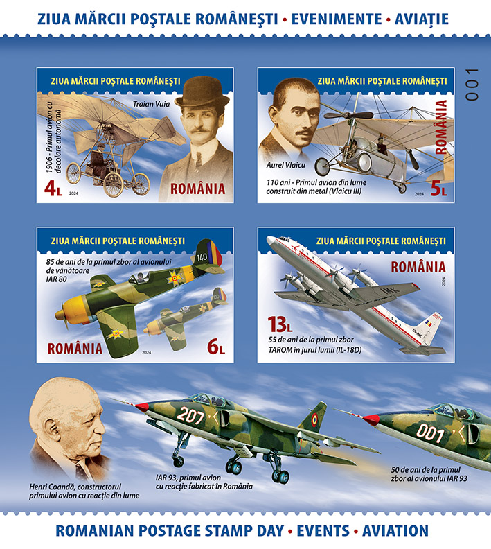 Henri Coandă, inventator de talie mondială, specialist în aerodinamică, este prezent în istoria aviației ca fiind constructorul primului avion cu reacție, realizat în anul 1910 (marca poștală cu valoarea nominală de 33 Lei din colița filatelică). Avionul IAR-93 a cărei imagine este reprodusă lângă portretul lui Henri Coandă este cunoscut ca primul avion cu reacție fabricat în România, având ca ghid și programul INCREST (al cărui director începând cu anul 1969 a fost Henri Coandă) și care a avut primul zbor în anul 1974.