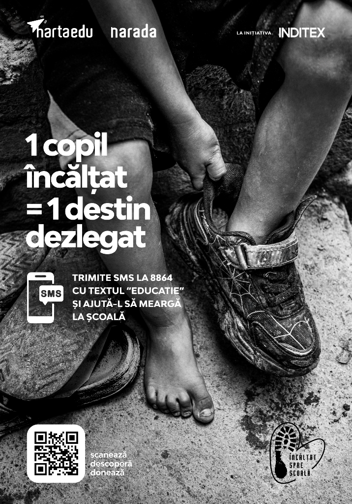 „1 copil încălțat = 1 destin dezlegat” propune să existe o colaborare strânsă între organizații, companii și persoane private, pentru a debloca potențialul copiilor din comunitățile vulnerabile și, astfel, să contribuie la generarea unor șanse egale la educație, copilărie și visare. Oricine poate contribui printr-un SMS la numarul 8864 cu textul EDUCATIE, online pe descult.hartaedu.ro sau la instalația imersivă creată de artista Irina Dragomir, expusă pe durata campaniei, în perioada 26 august-15 septembrie, timp de câte o săptămână, în centrele Băneasa Shopping City, Afi Cotroceni și Promenada Mall.