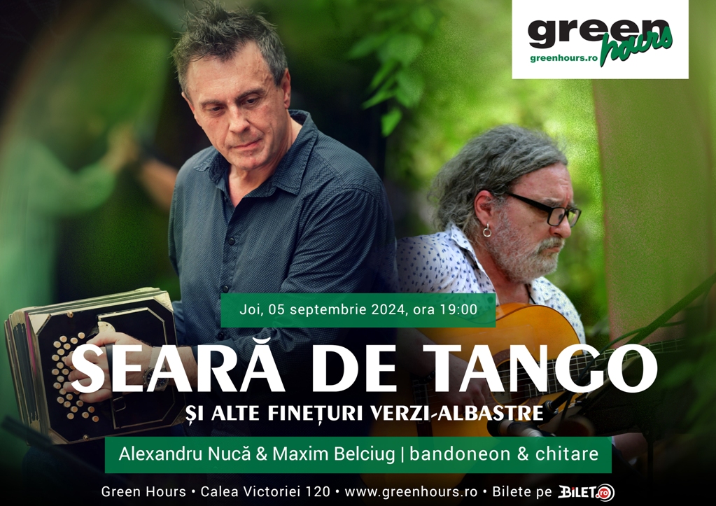 Joi, 5 septembrie 2024, ora 19:00, terasa verde de la Green Hours se învăluie în parfum de mare și de soare și devine scena unui concert de tango susținut de Alexandru Nucă (bandoneon) și Maxim Belciug (chitară). Cei doi artiști vor aduce în cea mai boemă grădină din București acorduri pasionale de tango, milonga, valsuri cu gust de visuri pierdute și alte finețuri verzi-albastre, senzuale ori sărate, ca-n versul lui Borges: “corzi aspre de chitară laborioasă, / urzind într-o milongă furtunoasă / și chef, și inocență, și sfidare.”