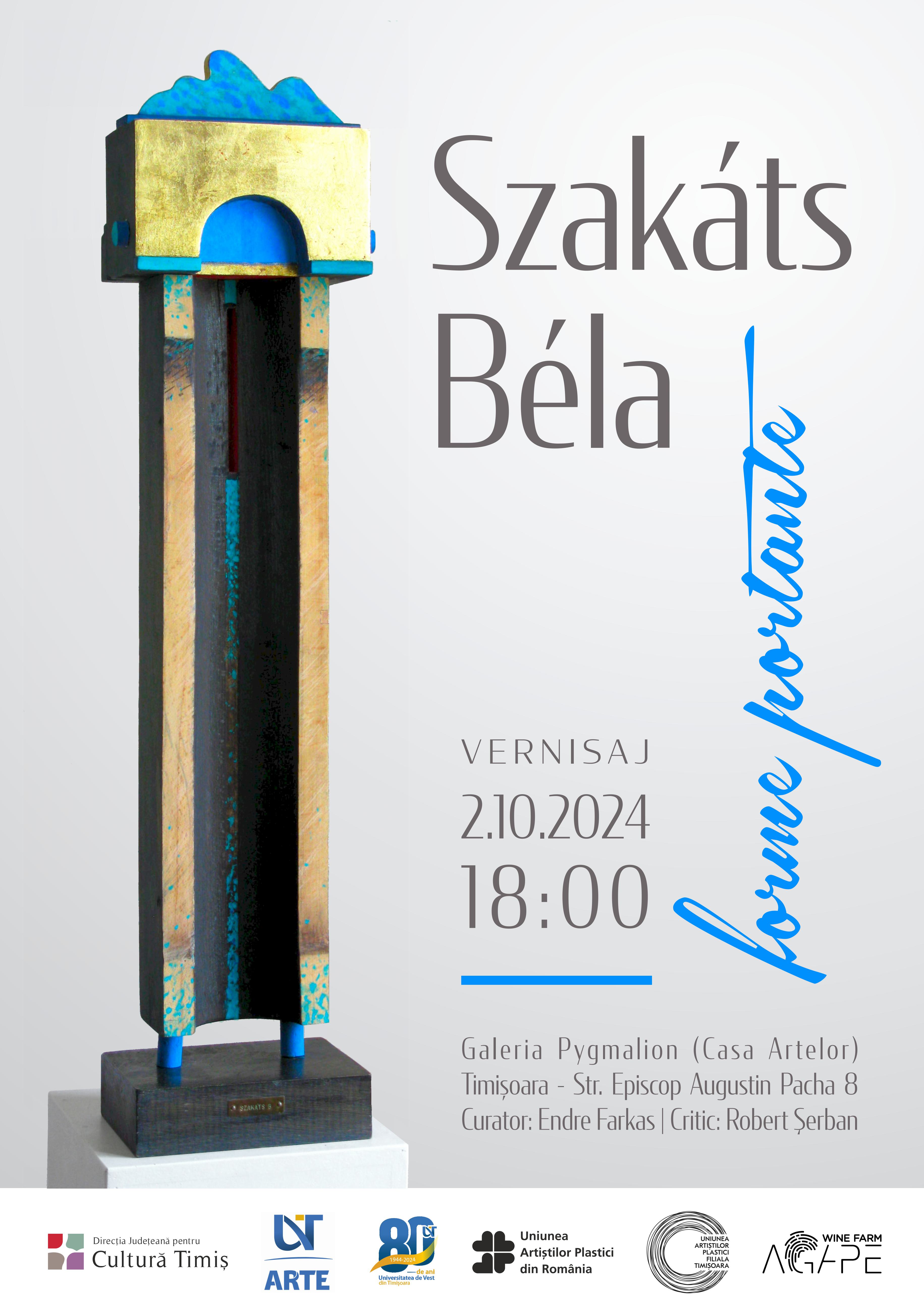 Galeria Pygmalion din Casa Artelor (str. Augustin Pacha, nr. 8) găzduiește miercuri, 2 octombrie, la ora 18.00, vernisajul expoziției Forme portante, semnată Szakáts Béla. Demersul plastic, vernisat de scriitorul Robert Șerban și curatoriat de Endre Farkas, aduce în fața publicului o parte mai puțin cunoscută a creației artistului timișorean: sculptura în lemn.