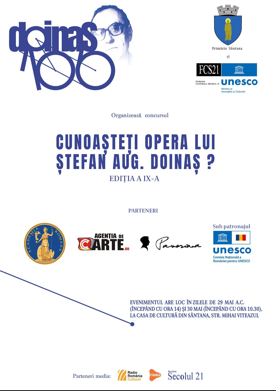 FUNDAȚIA CULTURALĂ SECOLUL 21 – Asociație pentru UNESCO organizează la Sântana (Arad), în zilele de joi 29 și vineri 30 mai 2025, cu sprijinul PRIMĂRIEI SÂNTANA, a IX-a ediție a Concursului „Cunoașteți opera lui ȘTEFAN AUG. DOINAȘ?”