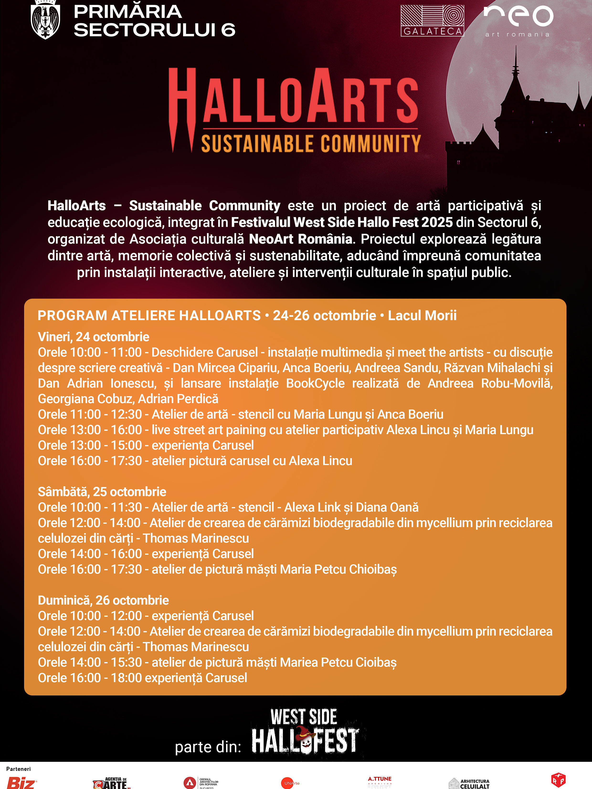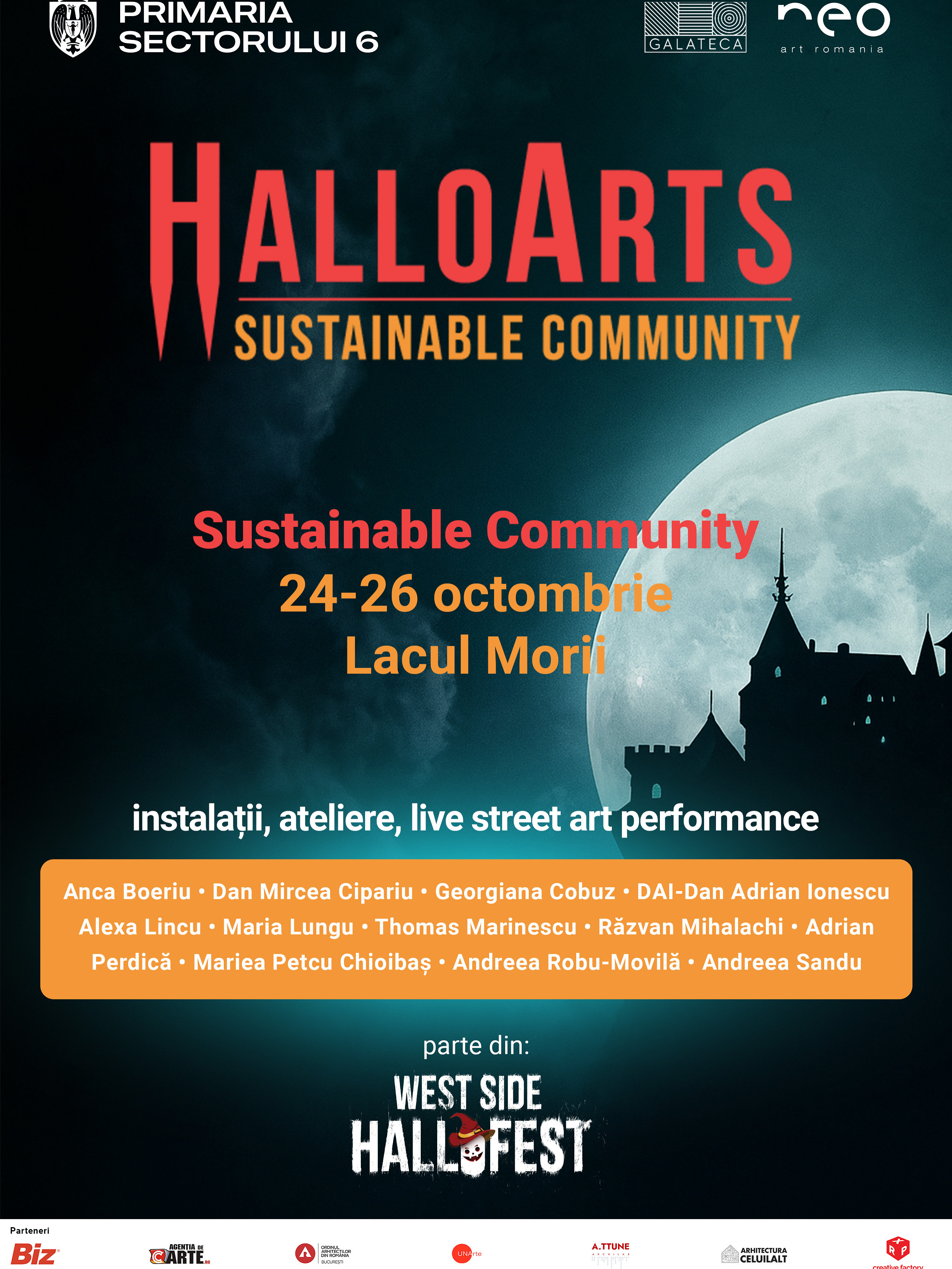 Vineri, 24 octombrie 2025, s-a deschis HalloArts, un nou proiect de instalații și ateliere dedicate comunității, organizat de Asociația Culturală NeoArt România și Galateca. Până duminică (între 24 și 26 octombrie 2025), în intervalul orar 10.00 – 18.00, la Lacul Morii HalloArts – Sustainable Community propune publicului o serie de activități culturale, un proiect de artă participativă și educație ecologică, integrat în cadrul Festivalului West Side Hallo Fest 2025, desfășurat și cofinanțat de Primăria Sectorul 6 a capitalei.