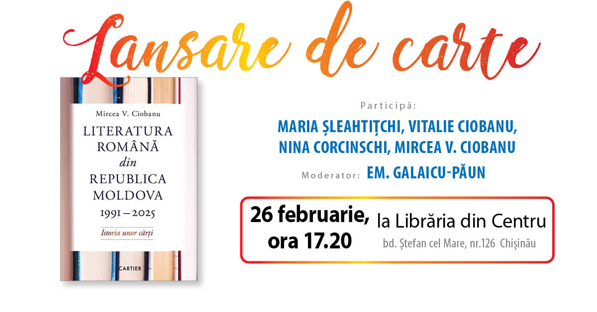 Joi, 26 februarie 2026, la ora 17.20, la Librăria din Centru (bd. Ștefan cel Mare, nr.126) din Chișinău, va avea loc lansarea volumului Literatura română din Republica Moldova 1991 – 2025. Istoria unor cărți, de Mircea V.Ciobanu, apărut la Editura Cartier.
