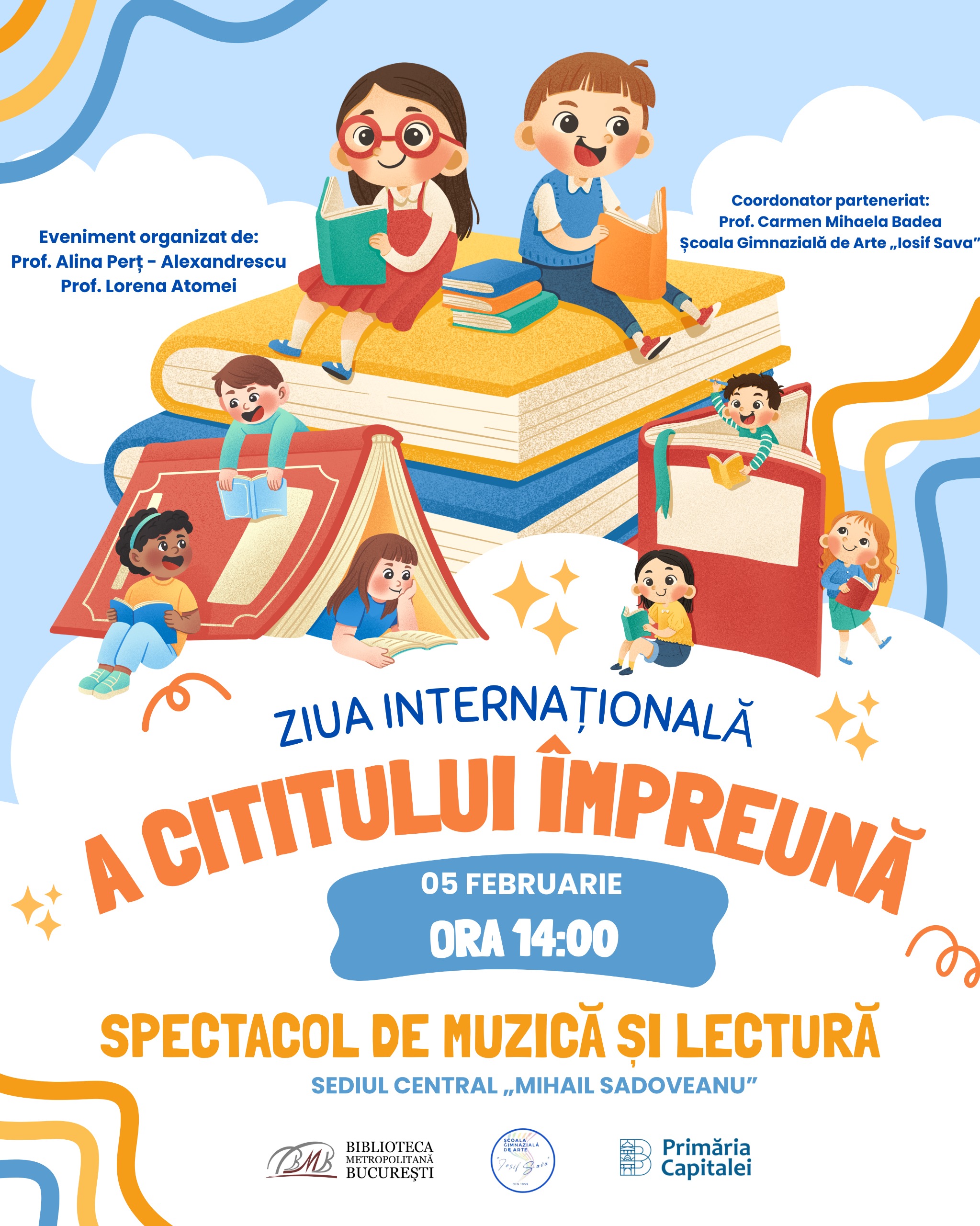 Primăria Municipiului București, prin Biblioteca Metropolitană București, în parteneriat cu Școala Gimnazială de Arte „Iosif Sava”, sărbătorește Ziua Internațională a Cititului Împreună printr-un spectacol de muzică și lectură, susținut de elevii claselor I –VIII, într-un eveniment care îmbină armonios cuvântul scris cu expresia muzicală.