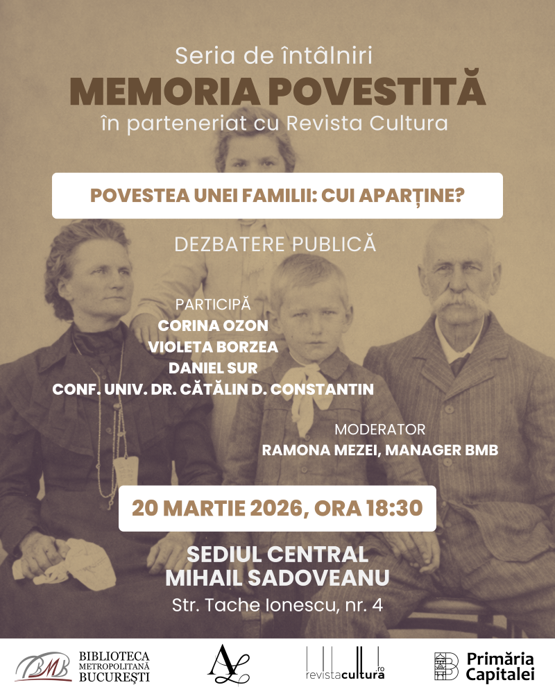 Primăria Municipiului București, prin Biblioteca Metropolitană București, invită publicul vineri, 20 martie 2026, de la ora 18:30, la dezbaterea publică „Povestea unei familii: cui aparține?”, care va avea loc la Sediul Central „Mihail Sadoveanu” al Bibliotecii Metropolitane București, Str. Tache Ionescu nr. 4, în Sala Auditorium. Evenimentul este organizat în parteneriat cu Revista Cultura.