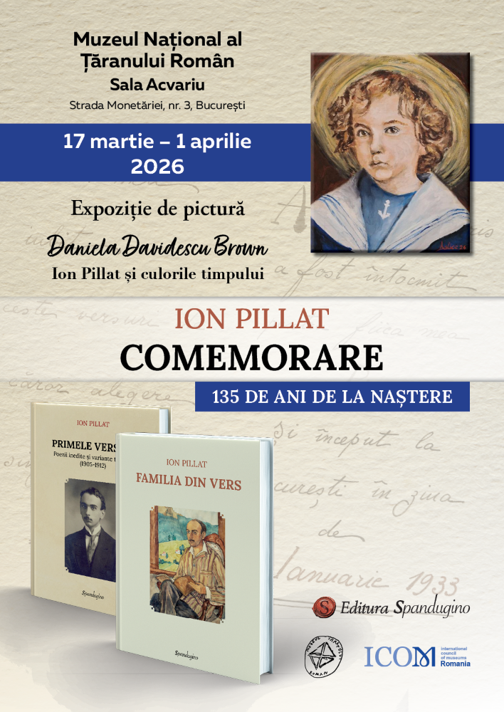 Editura Spandugino are plăcerea să vă anunțe deschiderea expoziției de pictură „Ion Pillat și culorile timpului”, aparținând artistei plastice Daniela Davidescu Brown, aflată la cel de-al treilea demers omagial, dedicat liricii pillatiene. Expoziția este găzduită de Muzeul Național al Țăranului Român, la Sala Acvariu (strada Monetăriei, nr. 3), iar vernisajul va avea loc marți, 17 martie, ora 17.00.
