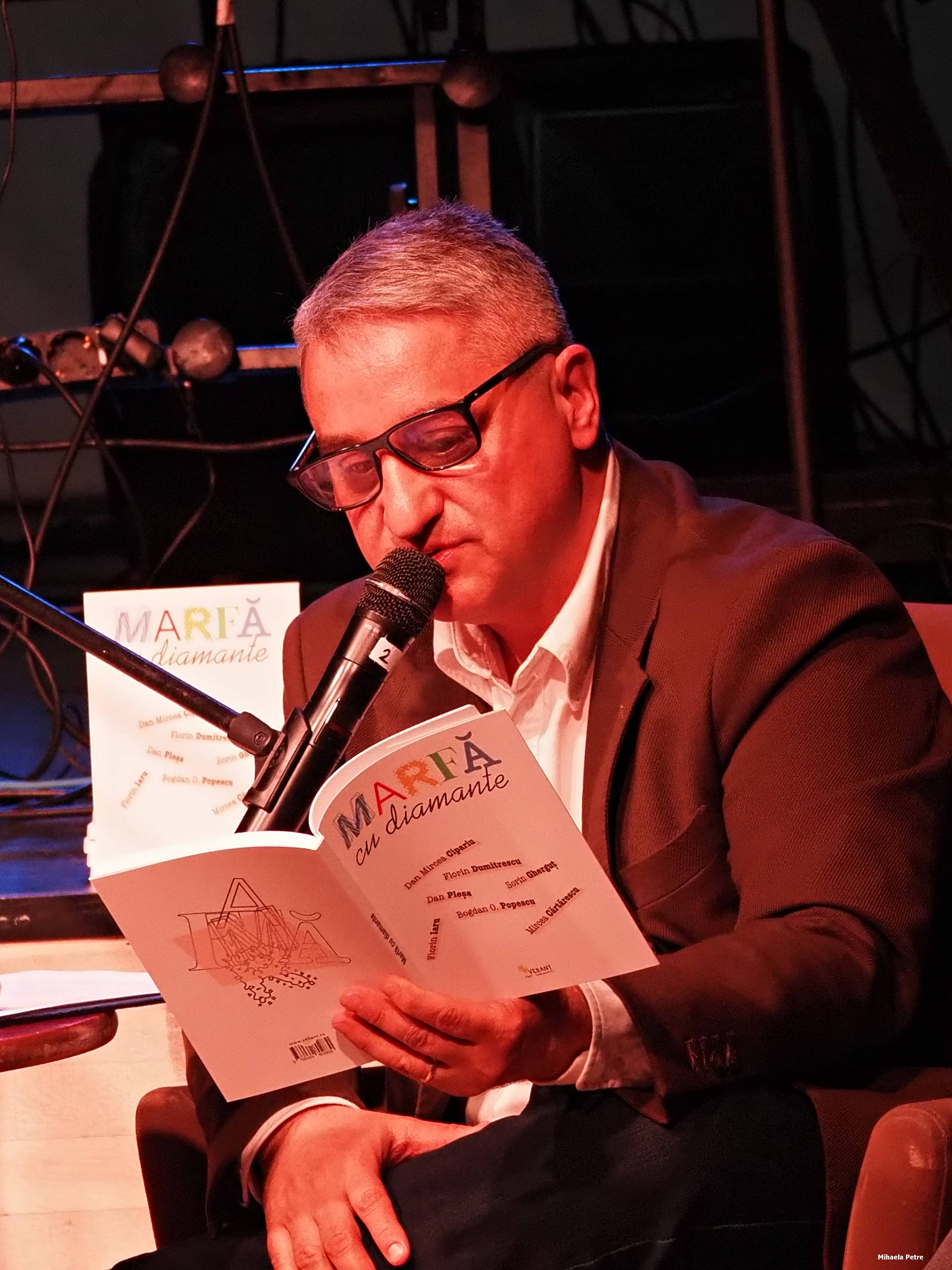 Dan Mircea Cipariu: O seară fastuoasă vă spune Dan Mircea Cipariu din sufrageria Teatrelli-Creart, unde am ales să sărbătorim împreună Ziua Mondială a Artei! Sunt bucuros să vă prezint împreună cu Mike Godoroja cel mai vechi și activ grup poetic din România – MARFĂ – care a lansat proiectul editorial și multimedia de poezie și blues „Marfă cu diamante”. Grupul poetic MARFĂ a luat ființă acum 30 de ani, în 1996, și este format din Dan Mircea Cipariu, Florin Dumitrescu, Sorin Gherguț, Dan Pleșa și Bogdan O. Popescu. Proiectul nostru este însoțit de nume consacrate ale literaturii române, invitații speciali Mircea Cărtărescu și Florin Iaru, cei care fac parte din antologia cult a generației 80 – „Aer cu diamante”. Trupa Mike Godoroja & Blue Spirit susține muzical acest proiect cu piese noi scrise pe versurile celor 5 poeți ai grupului. Pe pagina web marfacudiamante.ro puteți urmări desene și video poetry de Mihai Zgondoiu. Curator: Ana Daniela Sultana. Producător: Anamaria Spătaru. După show veți putea primi autografele autorilor pe volumul „Marfă cu diamante”, publicat la Editura Vellant.