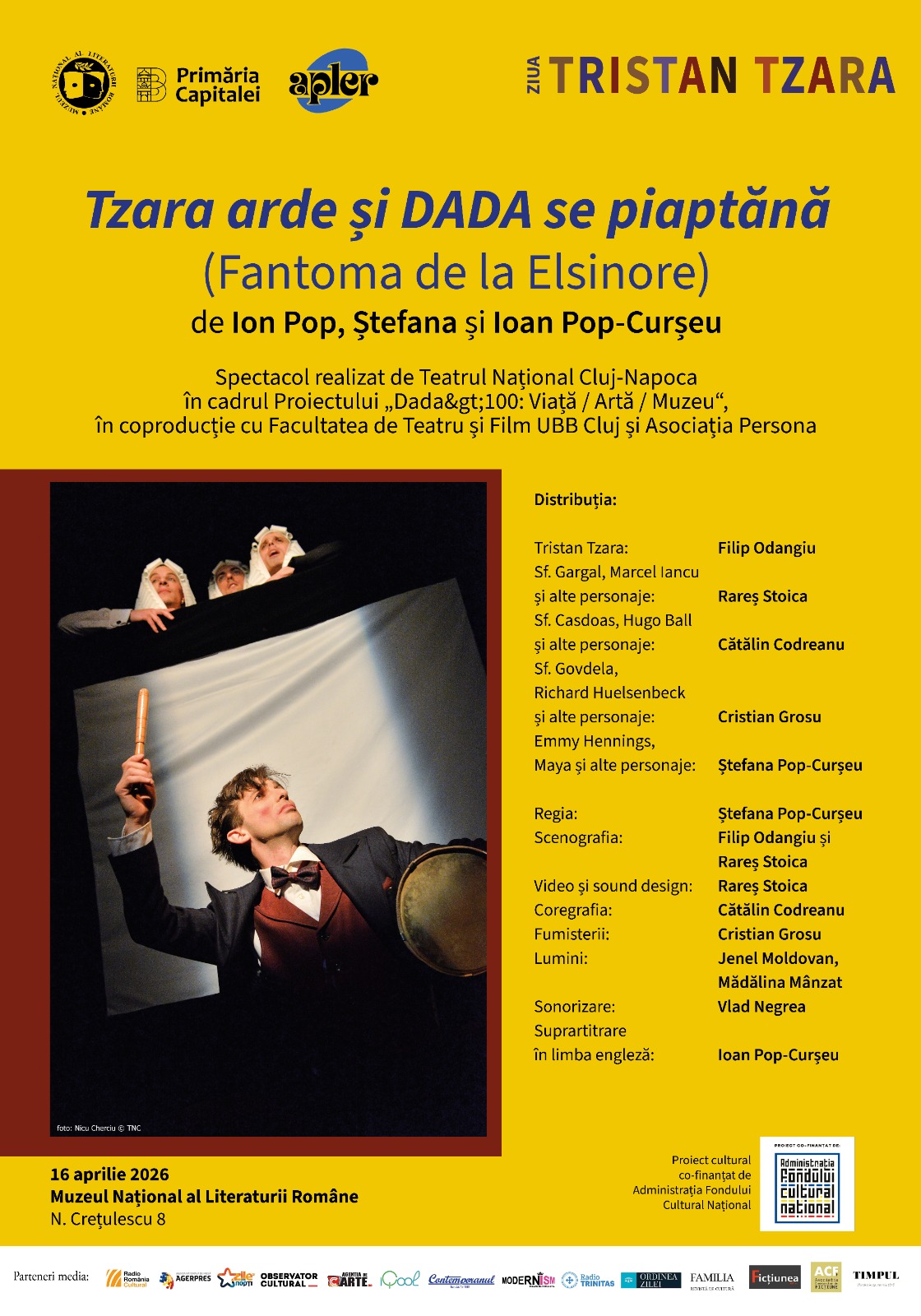 Evenimentul se va încheia cu proiecția spectacolului filmat Tzara arde și DADA se piaptănă (Fantoma de la Elsinore) de Ion Pop, Ștefana și Ioan Pop-Curșeu.